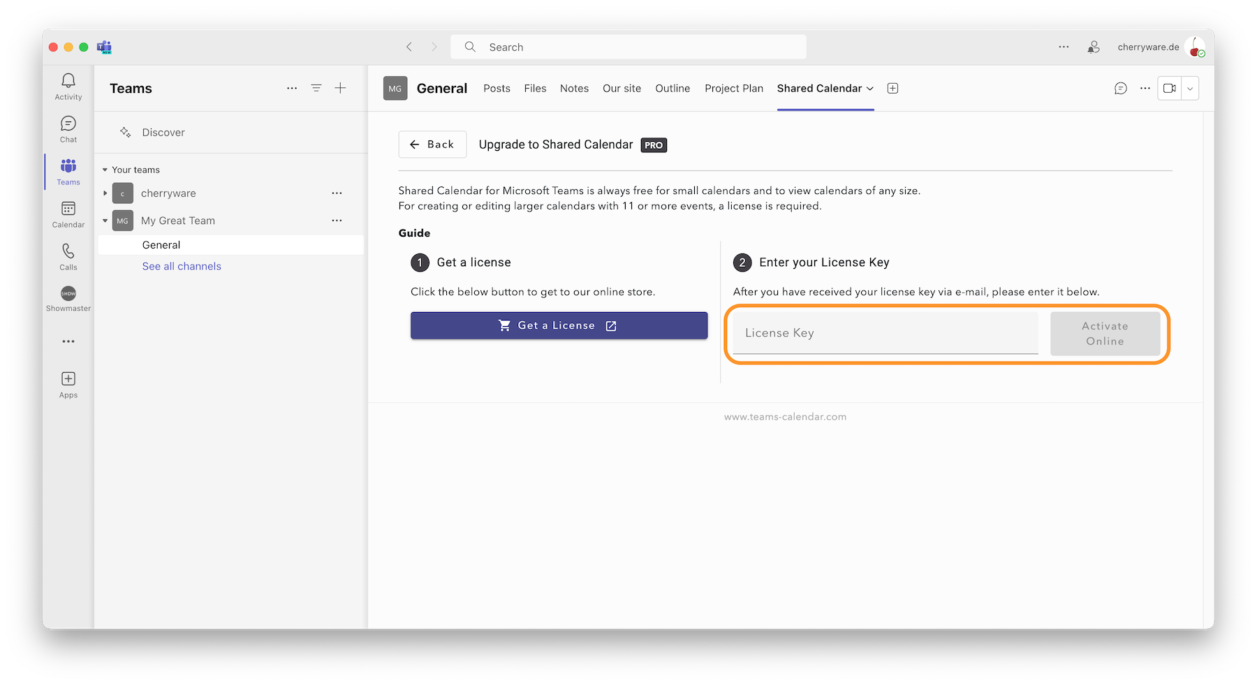 The same license key can be activated by the number of users that has been purchased. Each licensed user follows these steps to activate the Shared Calendar license in Microsoft Teams.